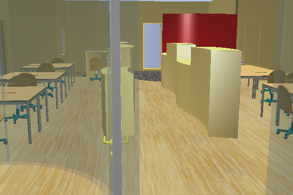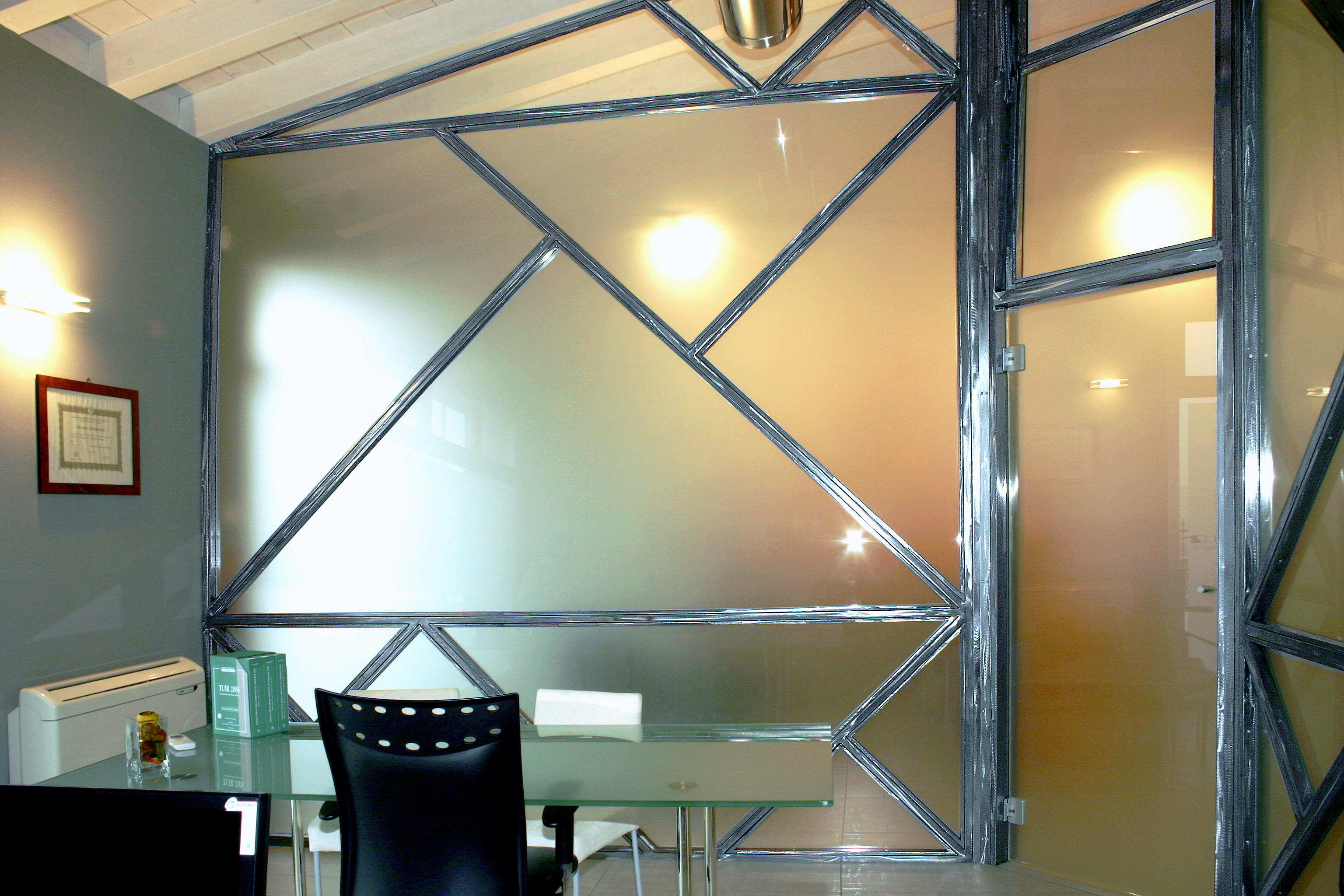 La soluzione: legno chiaro, vetro, acciaio, colori caldi. Ed un’onda sinuosa negli arredi che accoglie chi entra.